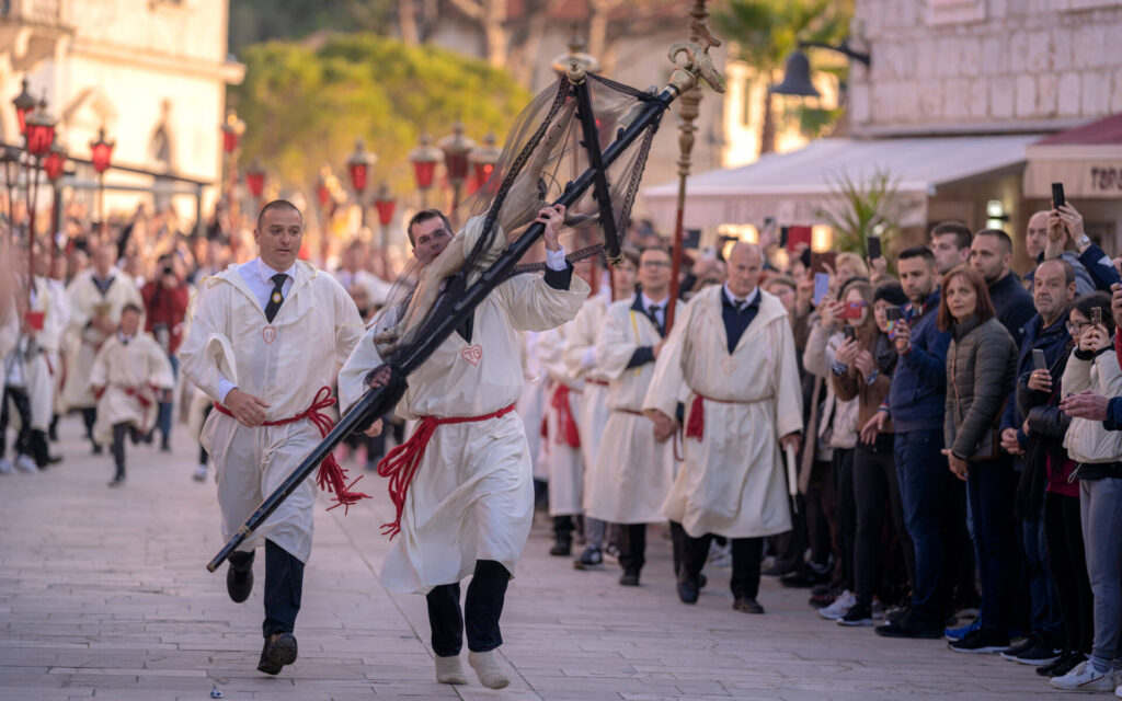 Algunas tradiciones religiosas se mantienen vivas desde hace siglos. Una de las más conocidas es la procesión Za Križen en la isla de Hvar, que se celebra durante la noche del Jueves Santo y recorre aproximadamente 22 kilómetros durante ocho horas, visitando seis parroquias. Durante la procesión, los participantes entonan cantos religiosos mientras los portadores de la cruz encabezan el recorrido.